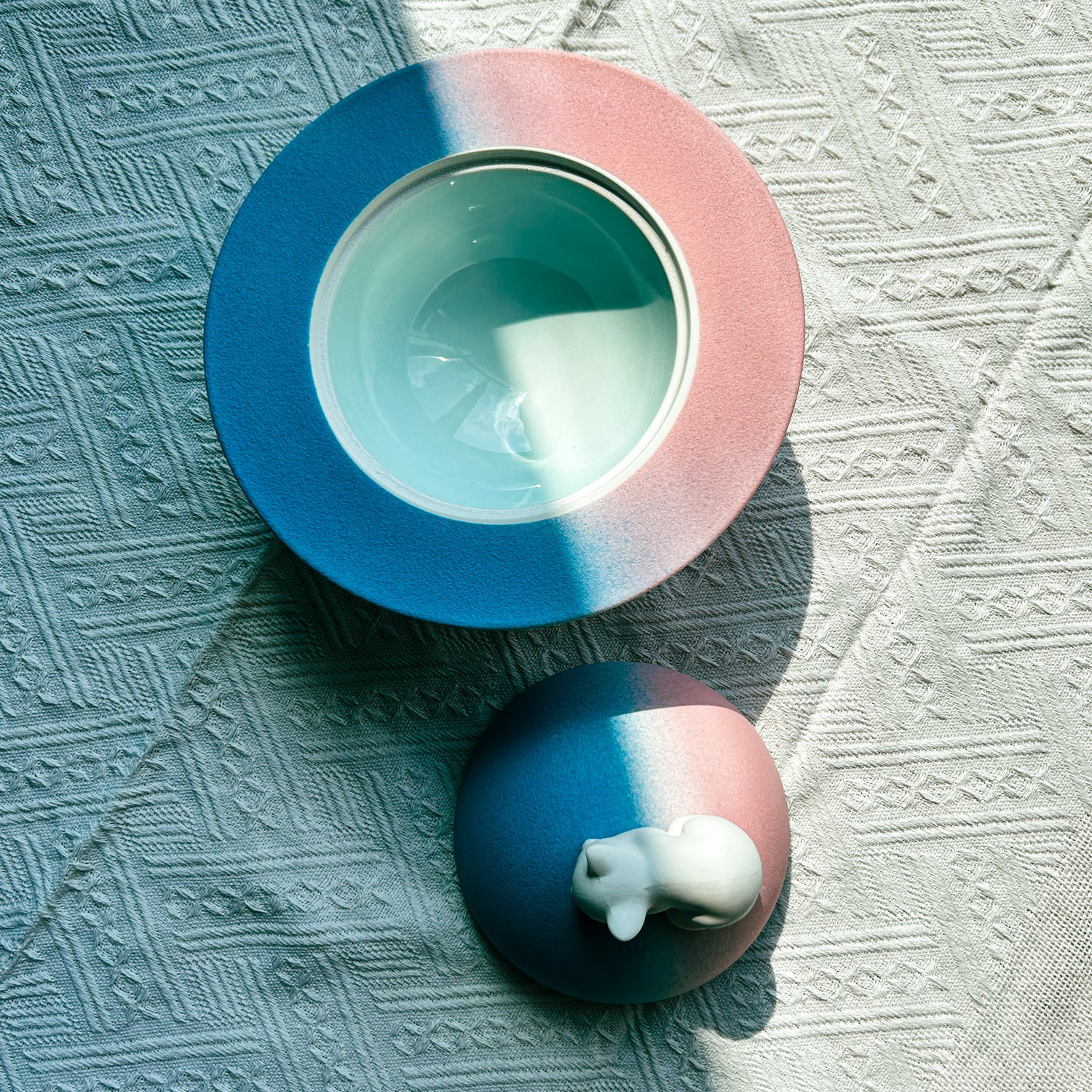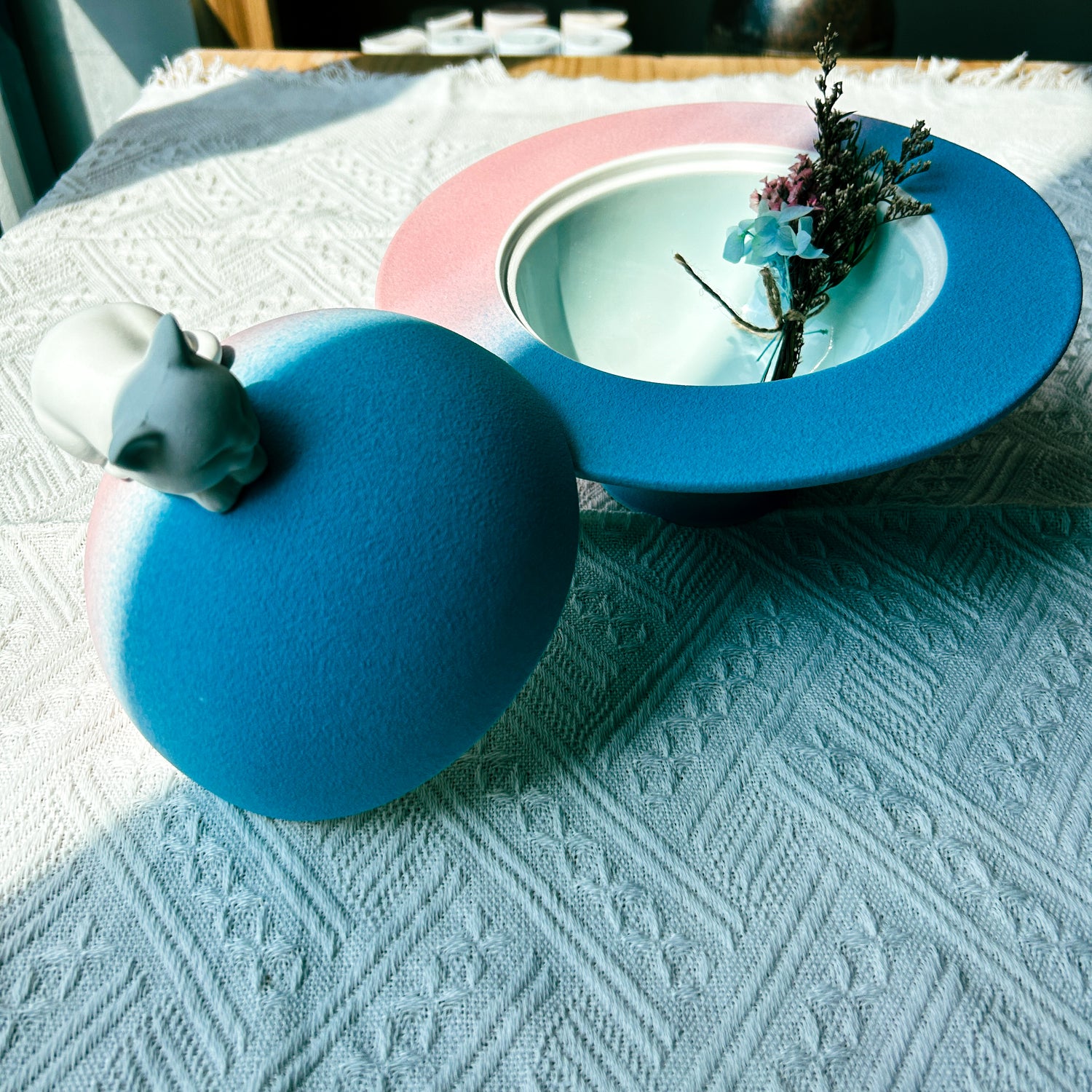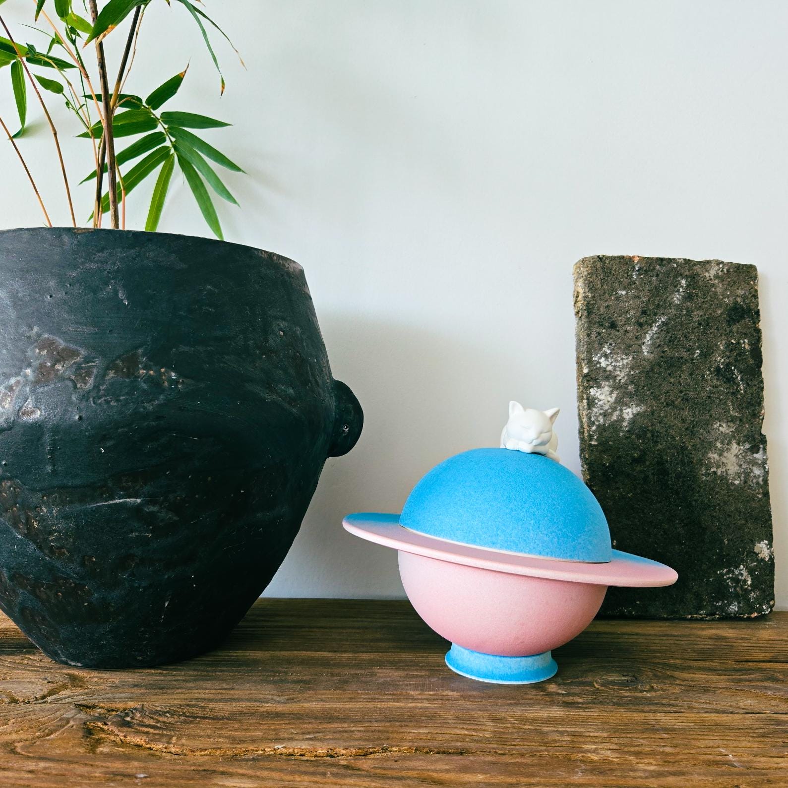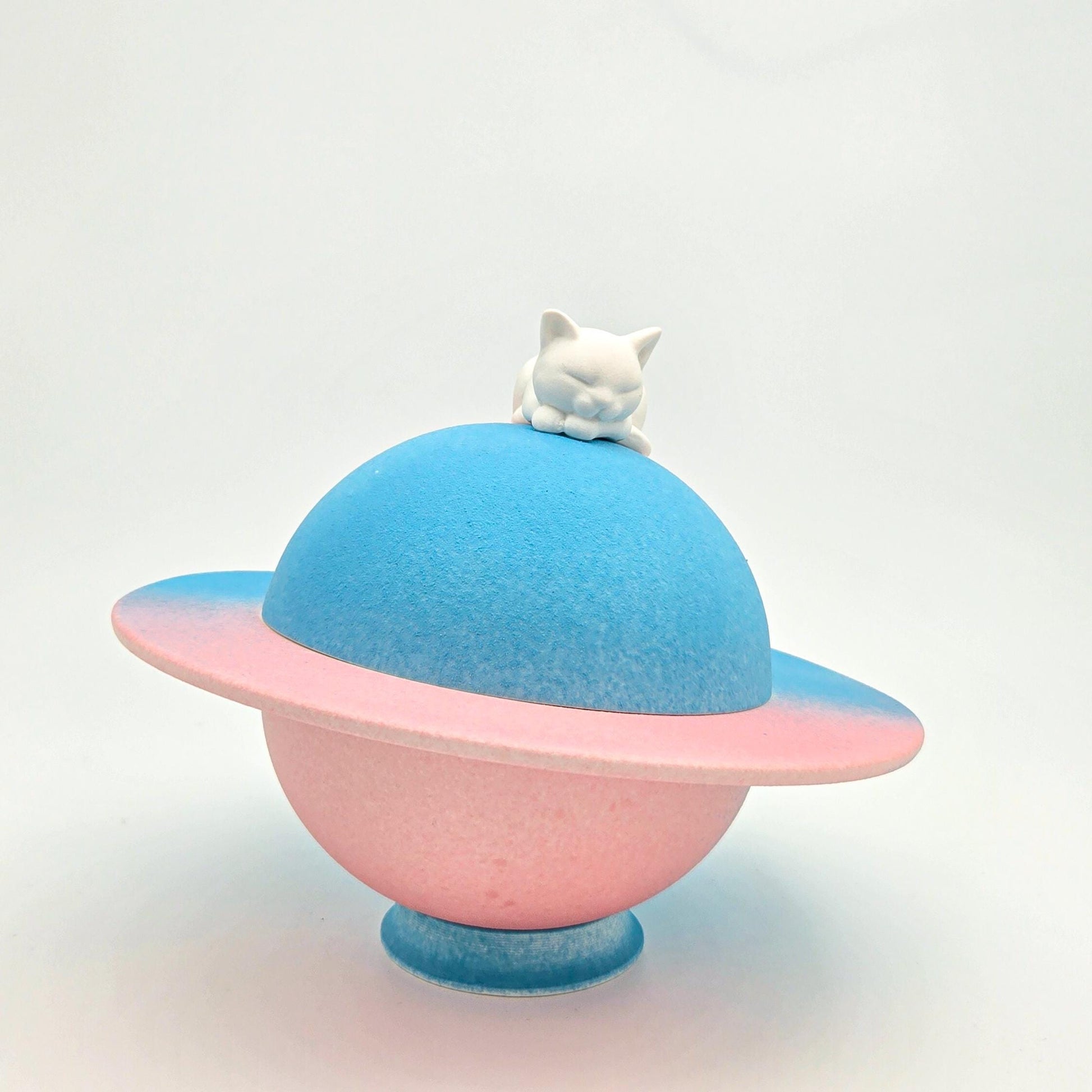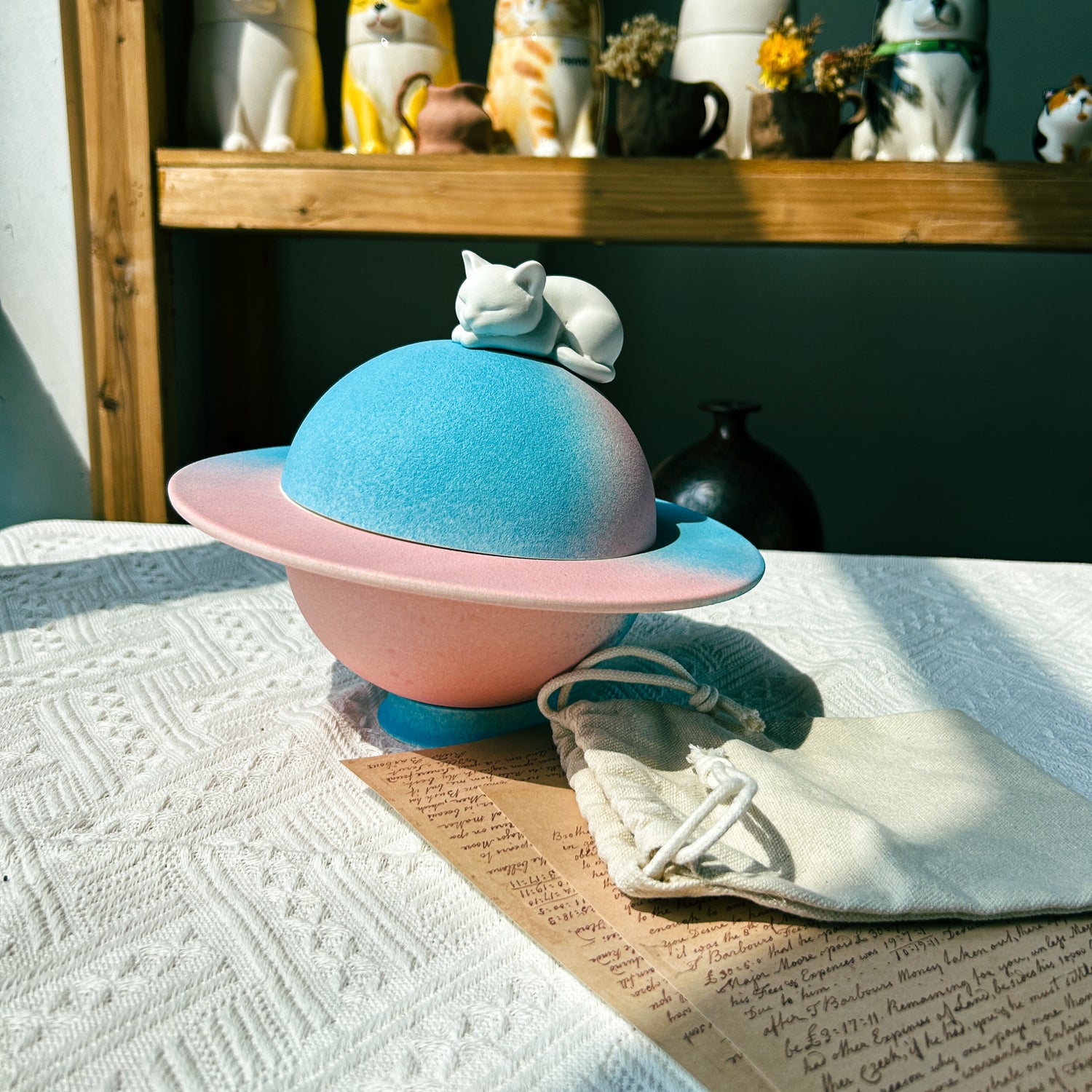 Discover serenity in the stars with this celestial-inspired ceramic cat urn, lovingly handcrafted to provide a peaceful resting place for your beloved pet. Shaped like a softly ringed planet and finished in dreamy pastels, this unique urn is both a touching tribute and a beautiful keepsake. Topped with a sleeping white cat figurine, the lid features a pure ceramic sculpture left unglazed so you can decorate it using markers — a heartfelt way to personalize your memorial with your cat’s markings, name, or a splash of their favorite color. Each piece is carefully crafted and glazed in soft, calming tones. Now, you can choose your planet’s color to make it even more personal.